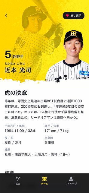 気になる選手や監督・コーチのプロフィール、詳細な成績をじっくりチェックできます。推し選手登録で選手をもっと深く知って、応援がもっと楽しく。