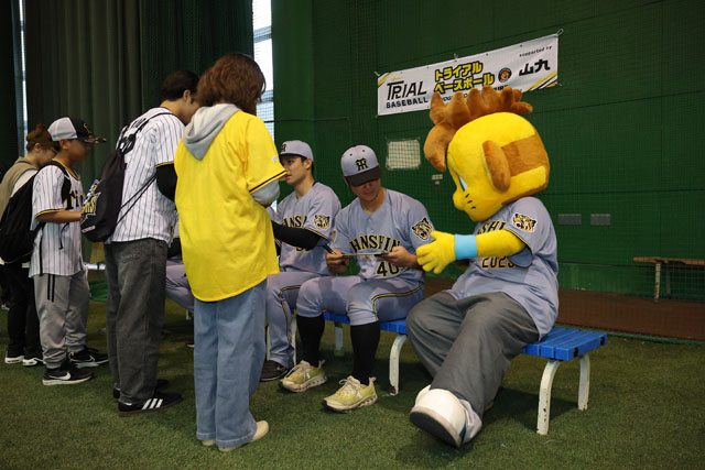 室内練習場では、練習見学会や地元・高知県の少年少女野球チームとタイガース・ファイティングドッグスの選手によるキャッチボールクラシック、ミート&グリート、サインボールプレゼント、そしてハイタッチ会が行われ、雨天にもかかわらずご来場いただいた全国のファンの皆さまとメモリアルな時間を過ごしました。